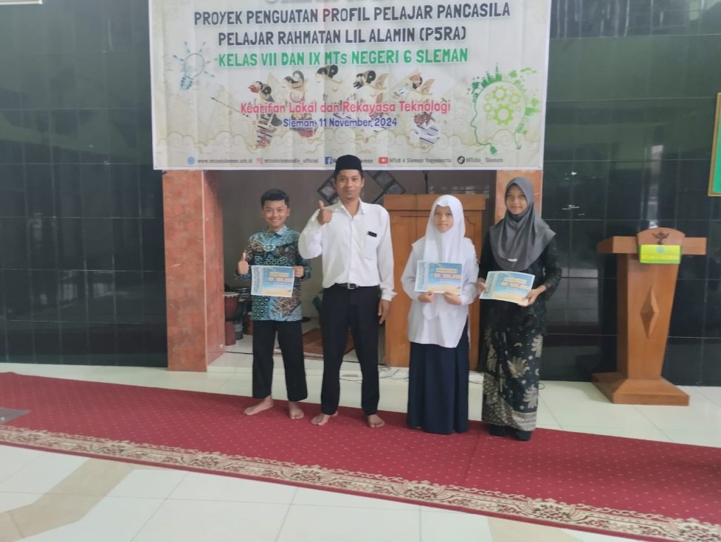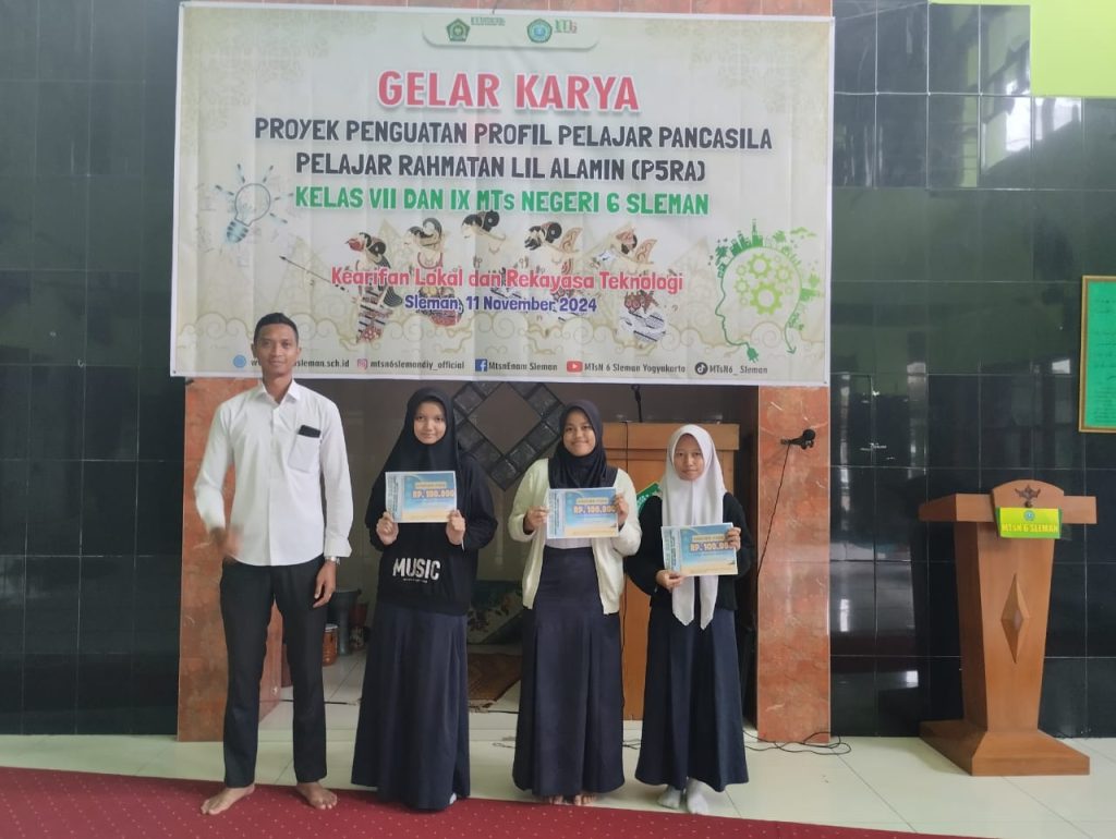 Kankemenag Sleman News (MTsN 6 Sleman )–Sembilan Kelompok P5RA dari Kelas 7 dan 9 MTsN 6 Sleman mendapatkan apresiasi dari madrasah. Apresiasi pertama diberikan 3 penyaji pada pembukaan Gelar Karya hari Senin (11/11/2024).