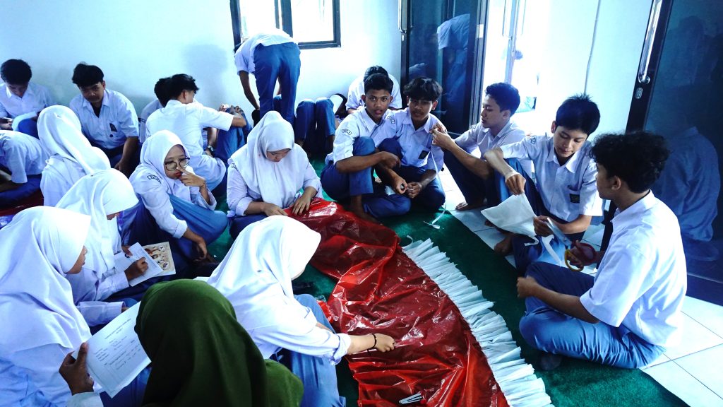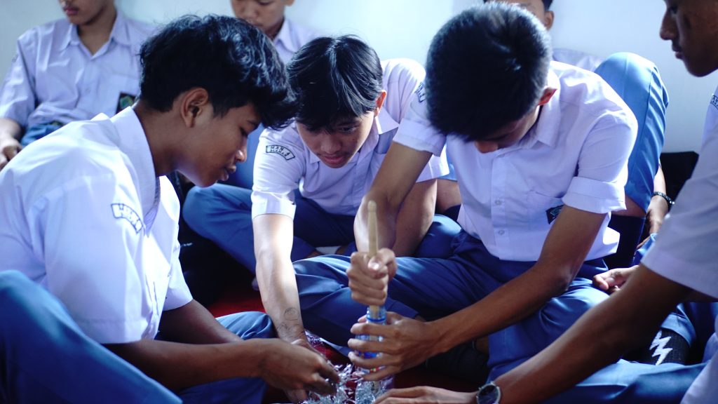 Dalam sesi ini, siswa diberi panduan langkah demi langkah pembuatan Ecobrick secara sederhana namun efektif. Proses dimulai dengan menyiapkan botol plastik bersih dan kering berukuran 1,5–2 liter. Sampah plastik kemudian dipotong kecil-kecil, dipastikan dalam kondisi bersih dan kering, lalu dimasukkan ke dalam botol dan dipadatkan dengan tongkat tumpul. Langkah terakhir adalah memastikan botol terisi penuh dengan Ecobrick yang padat dan tidak penyok saat ditekan.