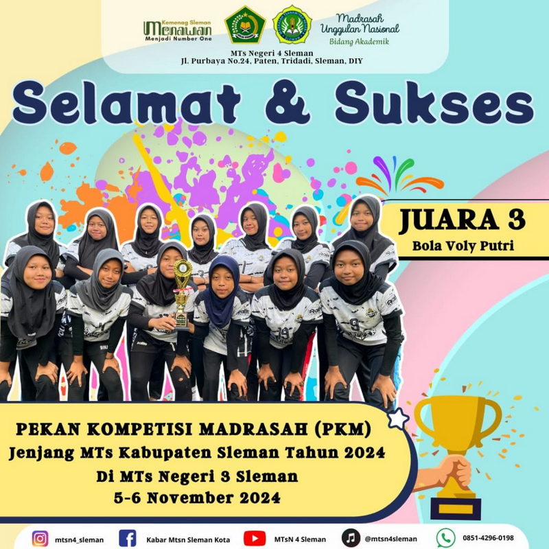 Kemenag Sleman News (MTsN 4 Sleman) – Tim bola voli putri MTsN 4 Sleman berhasil meraih juara 3 dalam ajang Pekan Kompetisi Madrasah (PKM) 2024 yang berlangsung di MTsN 3 Sleman, Selasa-Rabu (5-6/11/2024). Dalam pertandingan sengit tersebut, tim bola voli MTsN 4 Sleman menunjukkan semangat juang yang luar biasa, membuktikan bahwa kerja keras dan kekompakan adalah kunci utama keberhasilan mereka.
