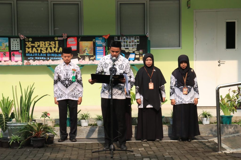 Upacara yang mengusung tema Guru Berdaya Indonesia Jaya ini dipimpin langsung oleh Kepala MTsN 9 Sleman Siti Juwariyah yang bertindak sebagai pembina upacara. Dalam kesempatan tersebut, beliau membacakan sambutan dari Menteri Agama Republik Indonesia yang berisi apresiasi terhadap dedikasi guru dalam mencerdaskan kehidupan bangsa dan pesan penting untuk terus berinovasi di era digital.