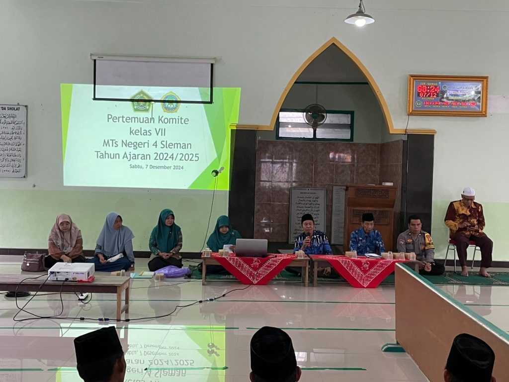 Kemenag Sleman News (MTsN 4 Sleman) – MTsN 4 Sleman menggelar pertemuan antara orang tua siswa dan pengurus komite dalam rangka mempererat komunikasi antara pihak madrasah, komite, dan orang tua siswa. Pertemuan ini dimaksudkan untuk menyampaikan program-program madrasah pada tahun ajaran 2024/2025, serta dilaksanakan dalam tiga sesi mulai pukul 08.00 hingga 12.00 WIB sesuai jenjang kelas masing-masing, yakni kelas VII, VIII, dan IX, Sabtu (7/12/2024).