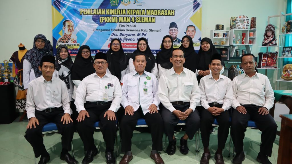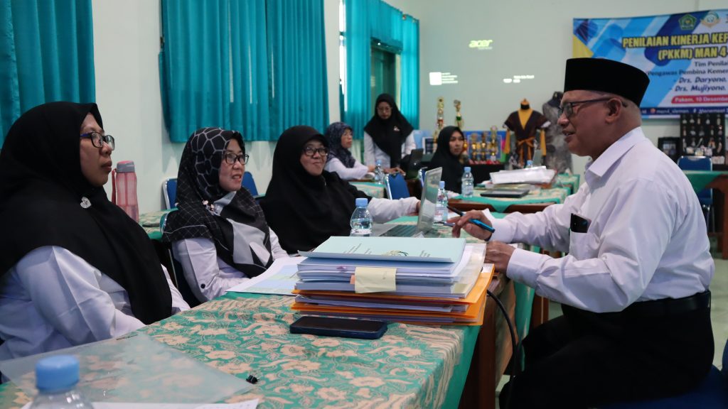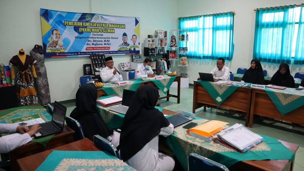 Sleman (MAN 4 Sleman)βAcara Penilaian Kinerja Kepala Madrasah (PKKM) di MAN 4 Sleman berlangsung dengan lancar pada Selasa (10/12/2024), bertempat di Aula Madrasah lantai 2. Penilaian ini dilakukan oleh dua pengawas madrasah dari Kantor Kementerian Agama Kabupaten Sleman, yaitu Drs. Daryono, M.Pd., dan Drs. Mujiyono, M.Pd.I.