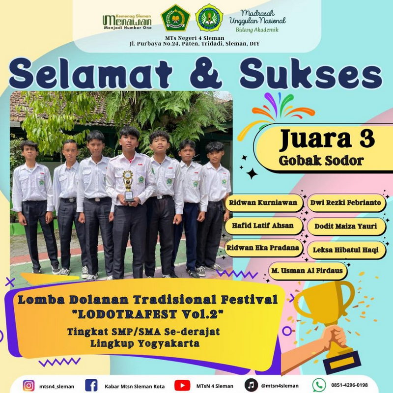 Kemenag Sleman News (MTsN 4 Sleman) – Tim Gobak Sodor MTsN 4 Sleman berhasil meraih juara 3 dalam ajang Lomba Dolanan Tradisional Festival (LODOTRAFEST) Vol. 2 yang diselenggarakan oleh Tim Event Organizer Prodi Pengelolaan Usaha Rekreasi (PUR) Universitas Negeri Yogyakarta (UNY) di Lapangan Pemda Sleman, Sabtu (30/11/2024).
