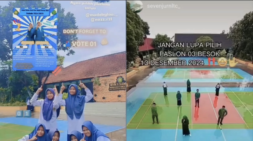 Kemenag Sleman News — Pemilihan ketua OSIS di MTs Negeri 3 Sleman akan dilaksanakan pada Jumat (13/2/2024). Menyambut hal tersebut, para siswa meramaikan pesta demokrasi dengan membuat poster dan video kampanye. Dimulai sejak tanggal 10 Desember kemarin, para siswa yang dibagi menjadi tiga tim sukses kompak berkampanye mendukung masing-masing paslon.
