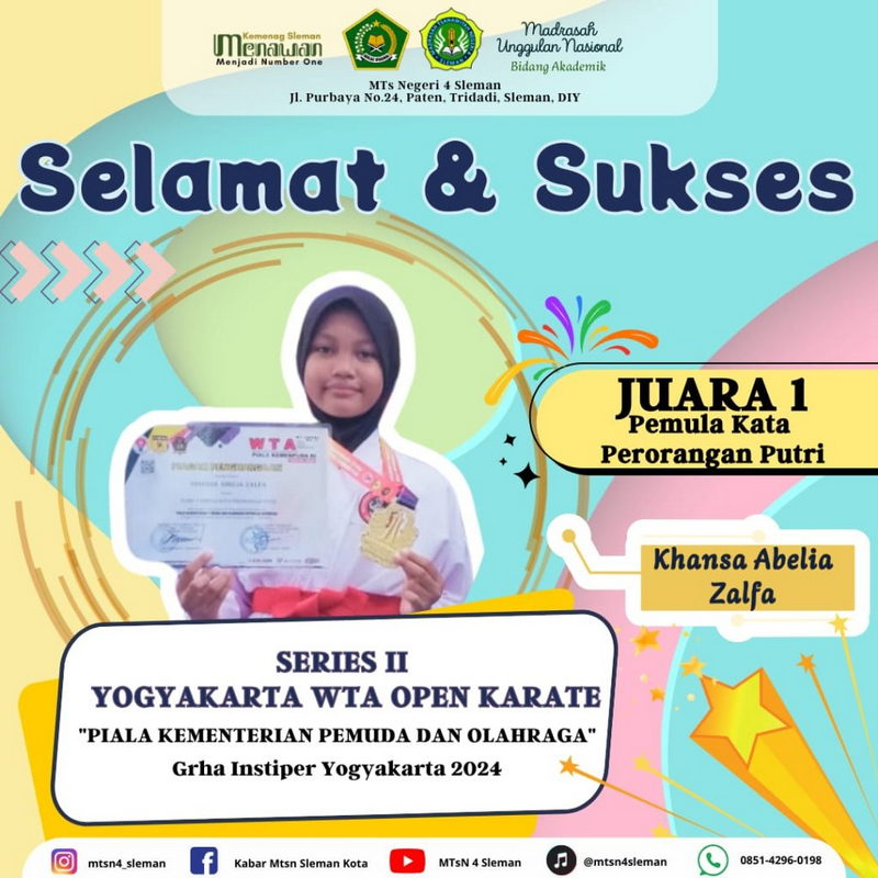 Kemenag Sleman News (MTsN 4 Sleman) – Prestasi gemilang kembali ditorehkan oleh siswa MTsN 4 Sleman, Khanza Abelia Zalfa. Ia berhasil meraih juara 1 kategori pemula kata perorangan putri pada kejuaraan Yogyakarta WTA Open Karate Championship yang memperebutkan piala Kementerian Pemuda dan Olahraga. Kompetisi tersebut berlangsung di Graha Instiper, Sleman, Yogyakarta, mulai Jumat (27/12/2024) hingga Minggu (29/12/2024).