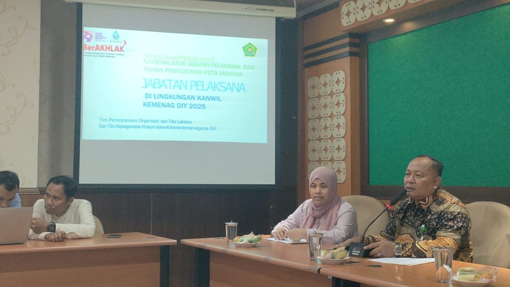 Kemenag Sleman News (MTsN 8 Sleman) – Aini Maslihatin, S.E., M.M., Kepala Tata Usaha MTsN 8 Sleman, menghadiri Sosialisasi dan Teknis Penyusunan Penyesuaian Peta Jabatan dan Analis Jabatan, serta Analis Beban Kerja pada Jabatan Pelaksana. Acara ini diselenggarakan oleh Kantor Wilayah Kementerian Agama Daerah Istimewa Yogyakarta di Ruang Rapat I Kanwil Kemenag D.I. Yogyakarta.
