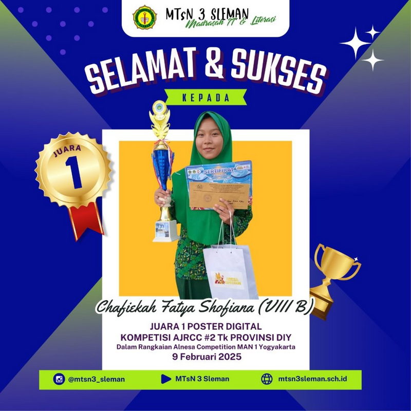 Kemenag Sleman News (MTsN 3 Sleman) – Siswa Madrasah Tsanawiyah Negeri (MTsN) 3 Sleman, Chafiekah Fatya Shofiana dari kelas VIII B berhasil meraih juara 1 dalam kompetisi poster digital yang diperuntukkan bagi siswa SMP/MTs sederajat di Daerah Istimewa Yogyakarta. Lomba ini berlangsung secara daring dengan babak final yang digelar secara langsung pada Sabtu (9/2/2025) di ruang Multimedia MAN 1 Yogyakarta. Lomba tersebut diselenggarakan oleh MAN 1 Yogyakarta melalui program acaranya yaitu Alnesa Junior Red Cross Competition (AJRCC) 2025.