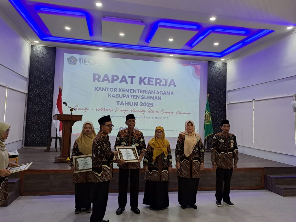 Sleman (MTsN 8 Sleman) – MTsN 8 Sleman kembali menorehkan prestasi membanggakan dengan menerima penghargaan sebagai Satuan Kerja Teraktif dan Informatif di Website Kemenag Sleman. Penghargaan ini diberikan oleh Kantor Kementerian Agama Kabupaten Sleman dalam Rapat Kerja Kementerian Agama Kabupaten Sleman yang diselenggarakan di BRI Corporate University pada Rabu (12/02/2025). Penghargaan diserahkan langsung oleh Kepala Tata Usaha Kantor Kementerian Agama Kabupaten Sleman, H. Sangaji, S.HI. kepada Kepala MTsN 8 Sleman, Agus Sholeh, S. Ag.