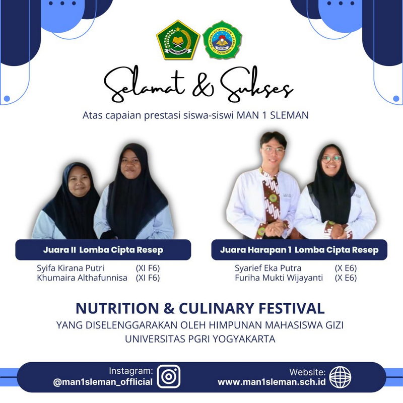 Kemenag Sleman News (MAN 1 Sleman) – Siswa-siswi MAN 1 Sleman kembali mengukir prestasi gemilang di tingkat nasional dalam ajang Nutrition and Culinary Festival yang diselenggarakan oleh Himpunan Mahasiswa Gizi Universitas PGRI Yogyakarta. Dalam kategori lomba Cipta Resep yang digelar pada pekan lalu, tim dari MAN 1 Sleman berhasil meraih dua penghargaan bergengsi. Pengumuman pemenang disampaikan pada Rabu (5/2/2025) di Instagram ncfupy.