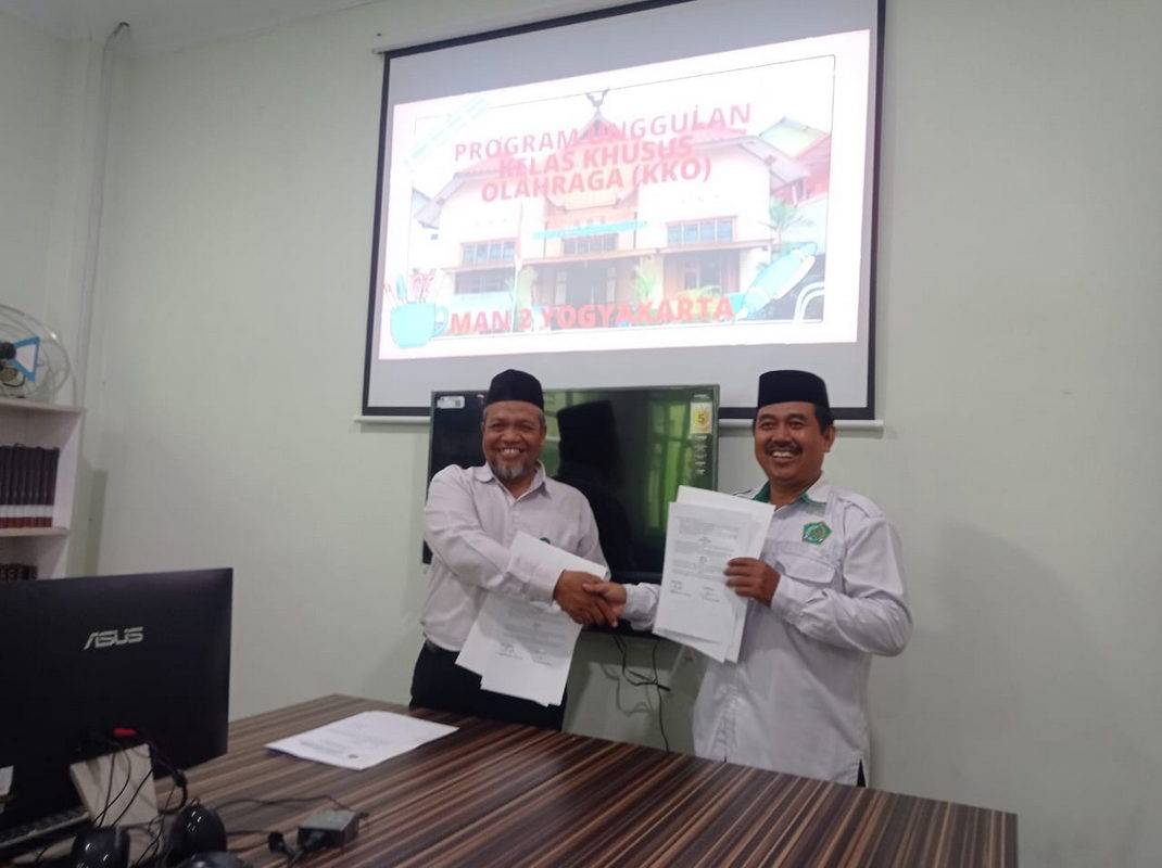 MTsN 1 Sleman dan MAN 2 Yogyakarta resmi menandatangani nota kesepahaman (MoU) terkait pengembangan Kelas Khusus Olahraga (KKO) dalam sebuah acara yang berlangsung di ruang pertemuan perpustakaan MAN 2 Yogyakarta pada Selasa, 18 Februari 2025.