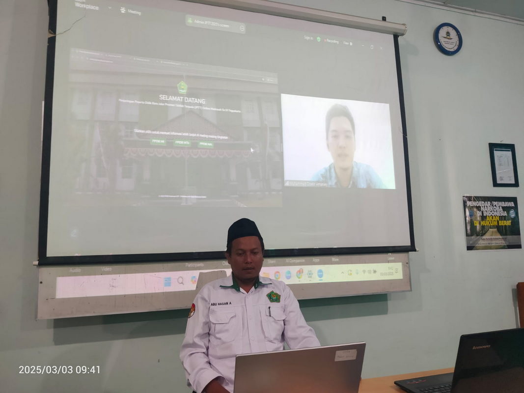 Kemenag Sleman News (MTsN 9 Sleman)- Operator MTsN 9 Sleman, Abu Hasan Al As’ari mengikuti rapat sosialisasi Penerimaan Peserta Didik Baru (PPDB) Jalur Prestasi Tahfidz Terpadu (JPTT) yang diselenggarakan oleh Kantor Wilayah Kementerian Agama (Kanwil Kemenag) DIY pada Senin (3/3/2025). Kegiatan ini berlangsung secara daring melalui zoom meeting dan diikuti oleh perwakilan madrasah di seluruh DIY.
