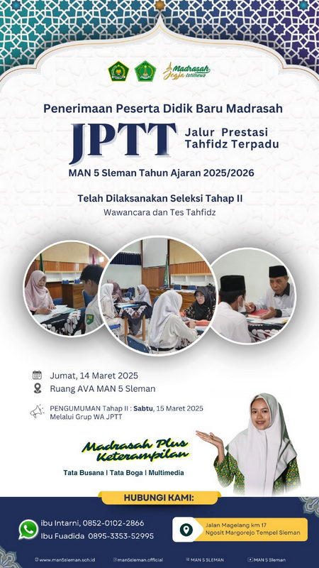 Sleman, 14 Maret 2025 – Madrasah Aliyah Negeri (MAN) 5 Sleman menggelar Seleksi Tahap II Penerimaan Peserta Didik Baru (PPDB) Jalur Prestasi Tahfidz Terpadu (JPTT) pada Jumat, 14 Maret 2025. Kegiatan ini berlangsung di ruang AVA mulai pukul 08.00 hingga selesai.