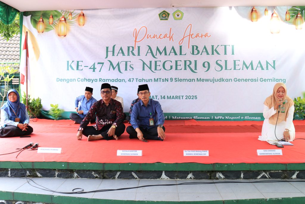 Kemenag Sleman News (MTsN 9 Sleman)- MTsN 9 Sleman sukses menggelar acara puncak peringatan Hari Amal Bakti (HAB) ke-47 pada Jumat (14/3/2025) di halaman madrasah. Acara yang berlangsung mulai pukul 14.00 hingga 18.30 WIB ini mengusung tema Dengan Cahaya Ramadan, 47 Tahun MTsN 9 Sleman Mewujudkan Generasi Gemilang.
