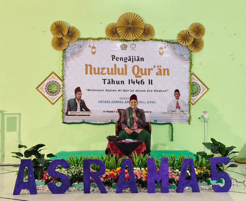 Kemenag Sleman News (MAN 2 Sleman) – Dalam rangka memperingati Nuzulul Qur’an MAN 2 Sleman menyelenggarakan kegiatan pengajian dengan tema “Relevansi Ajaran Al Qur’an dalam Era Modern”, tema ini diambil untuk mengingatkan kepada peserta didik bahwa walaupun Al Qur’an sudah lama diwahyukan kepada Nabi Muhammad SAW namun isi/kandungan didalamnya tetap dapat diimplementasikan sampai saat ini dan seterusnya tanpa adanya revisi. Pengajian Nuzulul Qur’an diselenggarakan pada Senin, (17/03/2025) di Masjid Baitul Mutaallimin MAN 2 Sleman. Mauidhoh Hasanah diiisi oleh Ustad Zaenal Arivin, S.Th.I., S.Pd.I.
