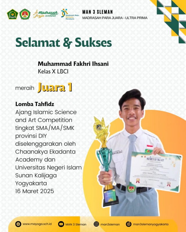 Kemenag Sleman News (MAN 3 Sleman) – Kabar membanggakan, siswa MAN 3 Sleman yakni Muhammad Fakhri Ihsani meraih juara 1 lomba tahfidz. Siswa kelas X LBCI yang akrab disapa Fakhri tersebut memenangkan lomba di ajang Islamic Science and Art Competition, Ahad (16/3/2025).