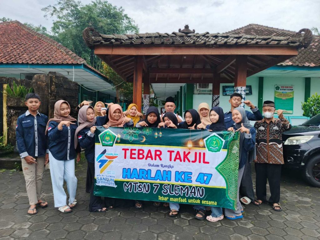 Kemenag Sleman News (MTsN 7 Sleman) – Dalam semangat berbagi di bulan suci Ramadhan sekaligus dalam rangkaian Harlah ke-47, MTsN 7 Sleman menggelar aksi sosial dengan membagikan takjil gratis kepada masyarakat. Kegiatan ini berlangsung pada Rabu, (19/03/2025), yang bertepatan dengan 19 Ramadhan 1446 H. Aksi sosial ini merupakan wujud kepedulian MTSN 7 Sleman terhadap masyarakat, khususnya mereka yang tengah dalam perjalanan atau membutuhkan makanan untuk berbuka puasa. Kepala MTsN 7 Sleman Samsul Arifin, S.Ag. terlibat langsung aktif dalam kegiatan tersebut yang dibantu guru dan OSIM yang diselenggarakan di beberapa titik strategis sekitar madrasah. Kepala MTsN 7 Sleman, Samsul Arifin, S.Ag., menuturkan bahwa kegiatan ini bertujuan menumbuhkan rasa empati dan kepedulian sosial di kalangan peserta didik.βKami ingin menanamkan nilai-nilai kebersamaan dan kepedulian kepada peserta didik kami, agar mereka tidak hanya cerdas secara akademik tetapi juga memiliki jiwa sosial yang tinggi.Dalam momen menyemarakkan Harlah ke-47 MTsN 7 Sleman yang juga bertepatan dengan bulan suci Ramadhan, dirasa merupakan momen yang sangat tepat untuk berbagi, dan kami berharap kegiatan ini dapat memberikan manfaat bagi masyarakat sekitar,β ujar Samsul.
