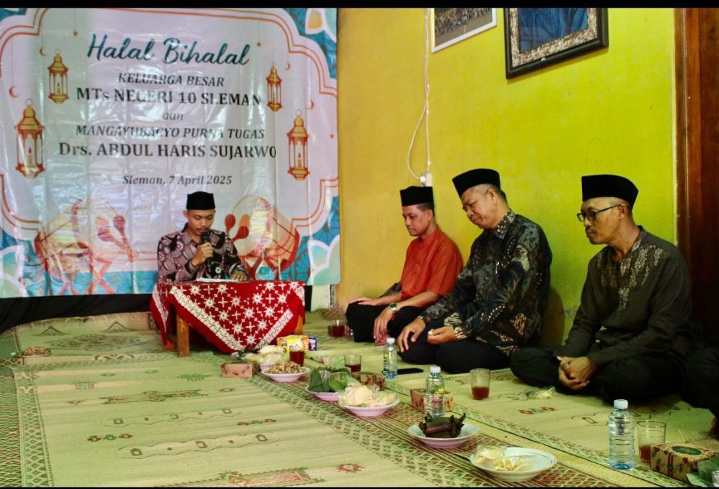 Kemenag Sleman News (MTsN 10 Sleman). Dalam KBBI, halalbihalal berarti maaf-memaafkan setelah menunaikan ibadah puasa Ramadhan, biasanya diadakan di sebuah tempat (auditorium, aula, dan sebagainya) oleh sekelompok orang. MTsN 10 Sleman kembali mengadakan Halalbihalal keluarga besar madrasah yang diikuti guru pegawai beserta keluarga, Senin (7/8/2025). Acara digelar di kediaman Staf TU Bapak Surip di Dusun Prujakan, Sinduharjo. Hadir pula tamu undangan pengurus komite MTsN 10 Sleman. Bertindak sebagai penceramah Ustaz Poniman, S.Ag pengawas madrasah area Klaten.