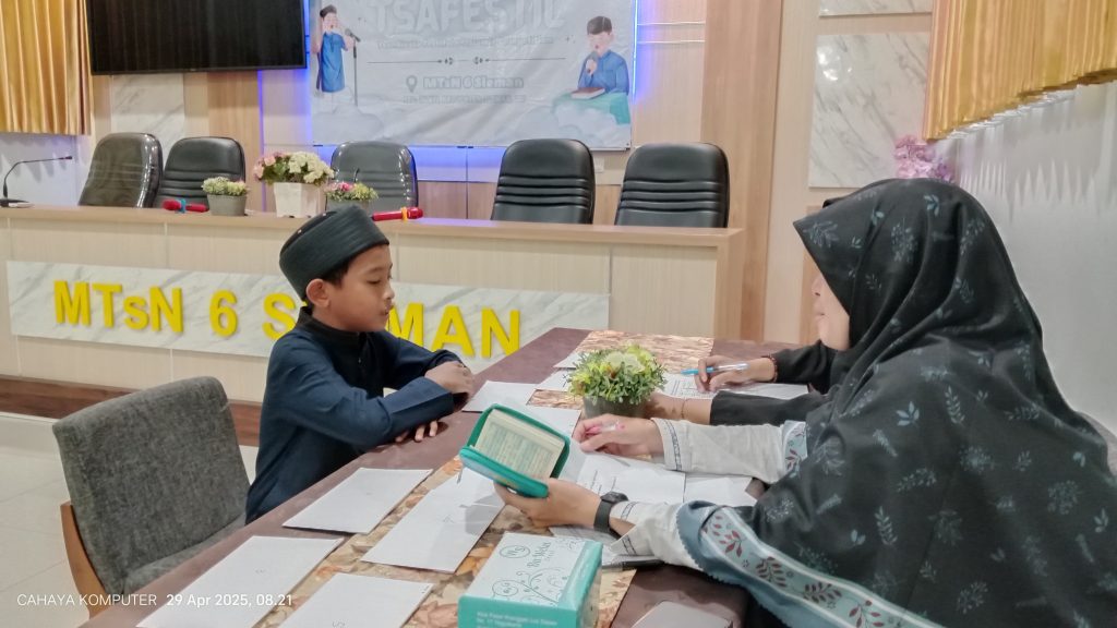 Kemenag Sleman News (MTsN 6 Sleman)–Tsafestic (Tsandiesta Festival Competition) digelar pada hari Selasa (29/4/2025) di tiga ruang di MTsN 6 Sleman. Tsafestoc melombakan tiga kategori yaitu Lomba Adzan, Musabaqah Tilawatil Quran (MTQ), dan Musbaqah Hifzhil Quran (MHQ).