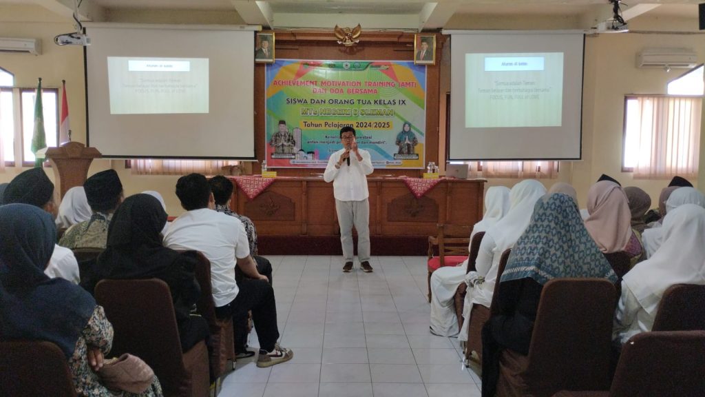 Kemenag Sleman News (MTsN 6 Sleman)–Achievement Motivation Training (AMT) bagi kelas IX digelar pada hari Jumat (2/5/2025) di Asrama Haji Ringroad utara. AMT ini diikuti seluruh Siswa kelas IX peserta orangtua/Wali siswa. AMT kali ini menghadirkan Bayu Satrio Wicaksono motivator yang sudah tidak asing lagi di Yogyakarta.