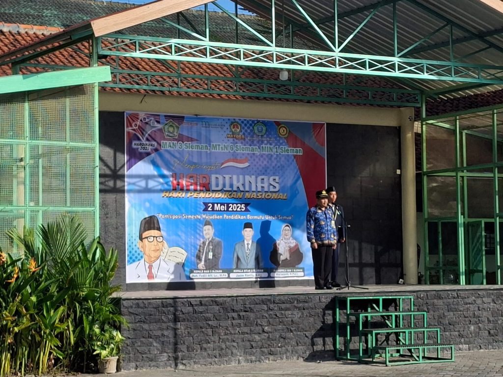 Kemenag Sleman News (MTsN 6 Sleman) – Jumat (2/5/2025) MTsN 6 Sleman memperingati Hari Pendidikan Nasional (Hardiknas) dengan upacara bersama madrasah integrasi (MIN 1 Sleman, MTsN 6 Sleman, dan MAN 3 Sleman) bertempat di lapangan upacara. Bertindak selaku Pembina upacara Moh. Fadlil Afif, Lc., M. Pd. kepala MAN 3 Sleman. Upacara bendera diikuti oleh seluruh siswa-siswi, guru dan pegawai madrasah integrasi.