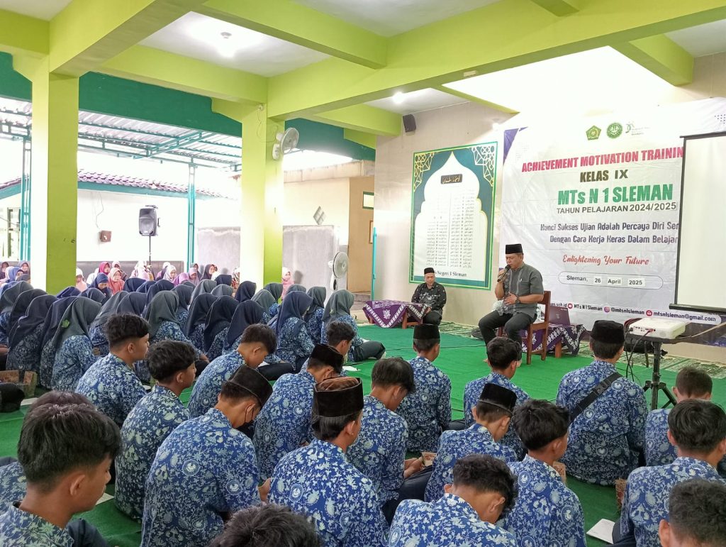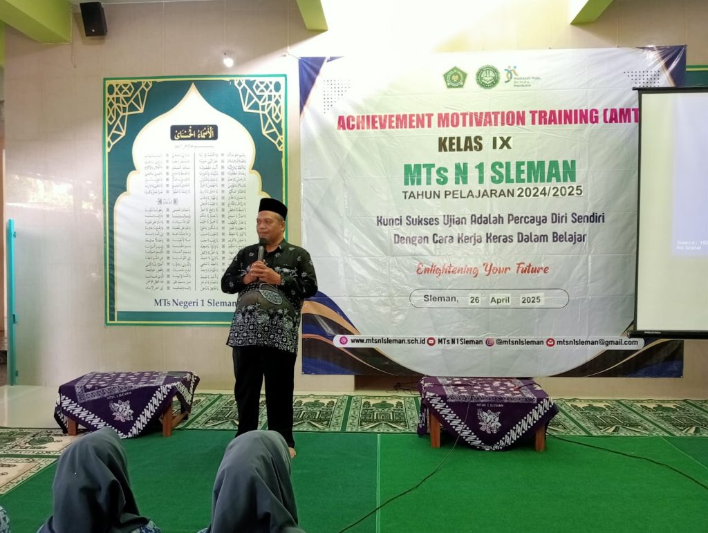 Kemenag Sleman News ( MTsN 1 Sleman) – Dalam rangka mempersiapkan siswa menghadapi Asesmen Standardisasi Pendidikan Daerah (ASPD), MTsN 1 Sleman menggelar kegiatan Achievement Motivation Training (AMT) bagi siswa kelas IX dan orang tua. Kegiatan ini dilaksanakan pada Sabtu (26/4/ 2025), bertempat di Musala Al Ikhlas.