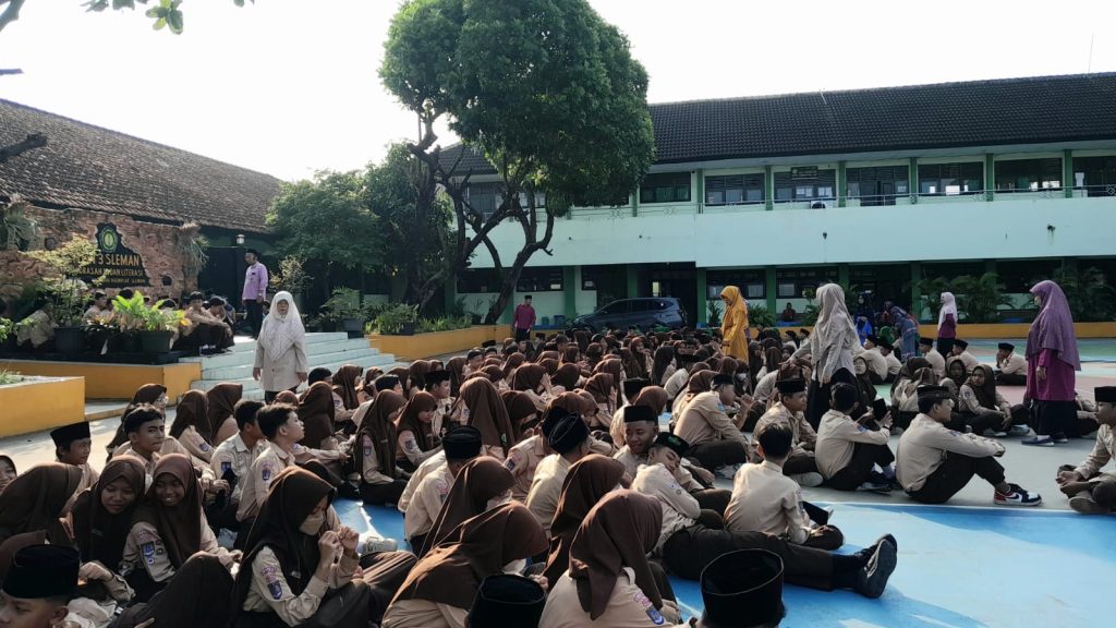Kemenag Sleman News (MTs N 3 Sleman) — Pada Jumat pagi, 09 Mei 2025, seluruh siswa dan siswi MTs Negeri 3 Sleman melaksanakan apel pagi di halaman madrasah. Kegiatan ini merupakan agenda rutin yang bertujuan untuk menanamkan disiplin serta menyiapkan siswa dalam menjalani hari pembelajaran. Namun, pada kesempatan kali ini, apel pagi dilanjutkan dengan kegiatan screening kerapihan yang melibatkan seluruh peserta didik.