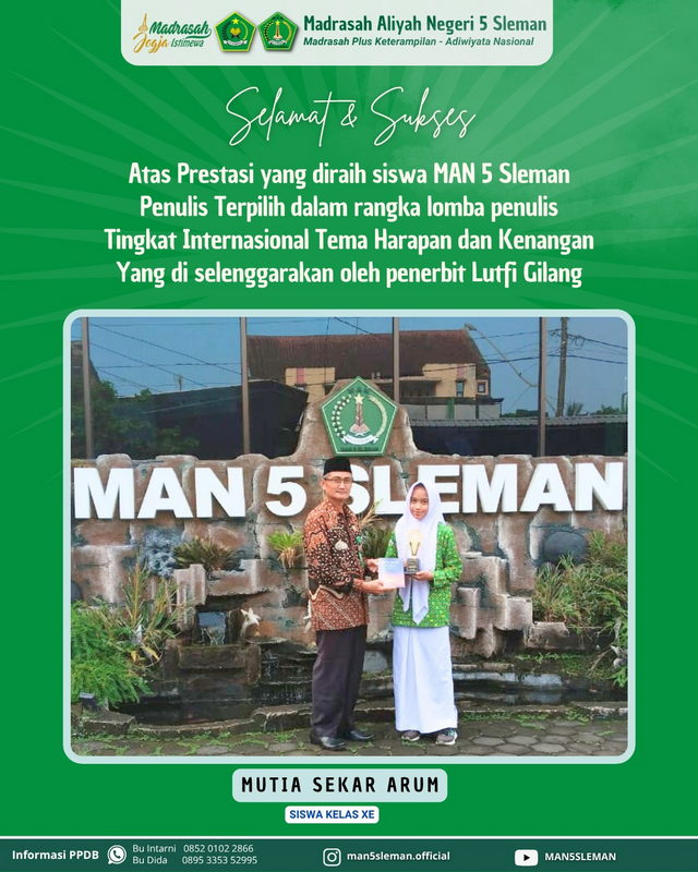 Kemenag Sleman News (MAN 5 Sleman) Mutia Sekar Arum, siswi kelas X E MAN 5 Sleman, berhasil meraih penghargaan sebagai Penulis Terpilih dalam ajang lomba penulis tingkat internasional yang diselenggarakan oleh Penerbit Luthfi Gilang, pada Rabu (14/05/2025). Dalam lomba ini, Mutia mengangkat tema “Harapan dan Kenangan”, yang berhasil memikat dewan juri.