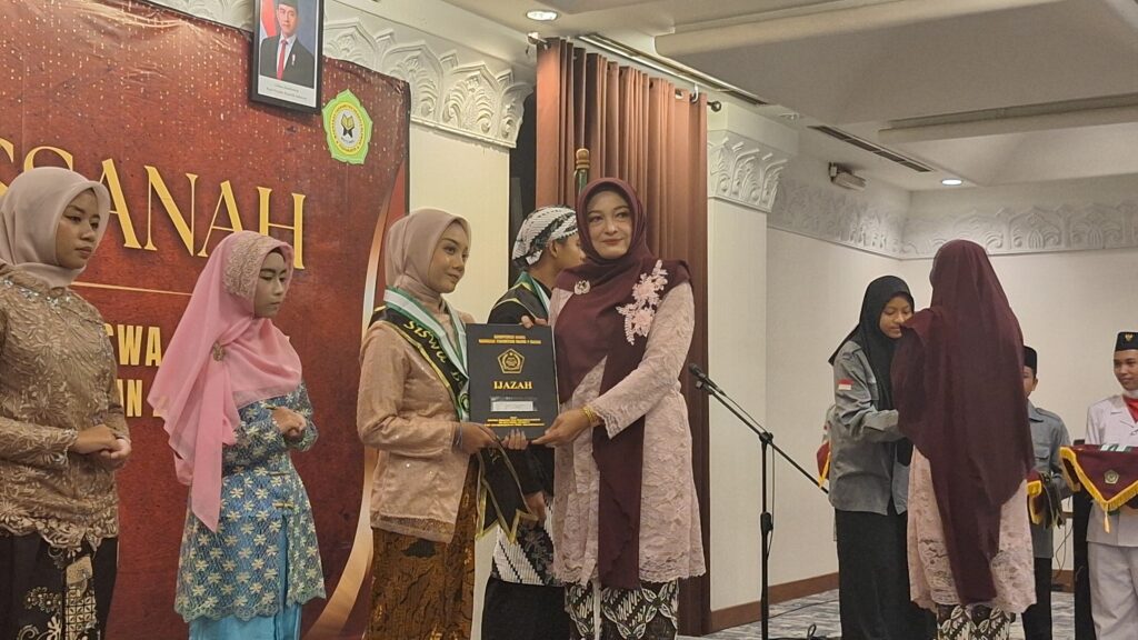 Kemenag Sleman News (MTsN 9 Sleman)— Kepala MTsN 9 Sleman memberikan penghargaan kepada siswa berprestasi nonakademik pada acara Akhirussanah yang digelar di Hotel Grand Diamond pada hari Senin (2/6/2025) dengan mengalungkan slempang prestasi. Sebanyak lima siswa menerima anugerah atas prestasi mereka di bidang nonakademik, di antaranya Raditya Wisnuaji Zuhair Farras Al Zafran dari kelas IXD, Rizki Valent Amalan Andini dari kelas IXC, Nisrina Ghina Lathifah Yumna dari kelas IXB, Ayrin Naura Ratnadewati dari kelas IXC, dan Annisa Kaylani zahrah dari kelas IXC.