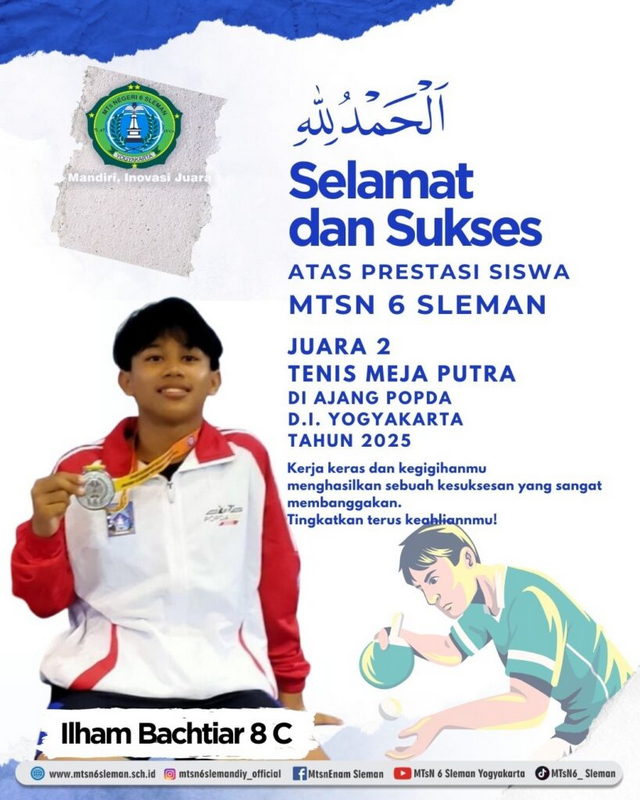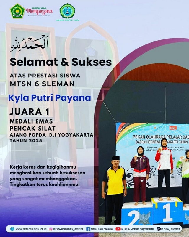 Kemenag Sleman News (MTsN 6 Sleman)–Kyla Putri Payana dan Ilham Bahtiar siswa kelas VIII telah berhasil menyabet medali dalam Pekan Olahraga Pelajar Daerah (POPDA) Daerah Istimewa Yogyakarta. Kyla sabet medali emas di cabang pencak silat, sedangkan Ilham menyabet medali perak di cabang tenis meja. Penyerahan medali kepada kedua siswa pada hari Sabtu (24/5/2025).