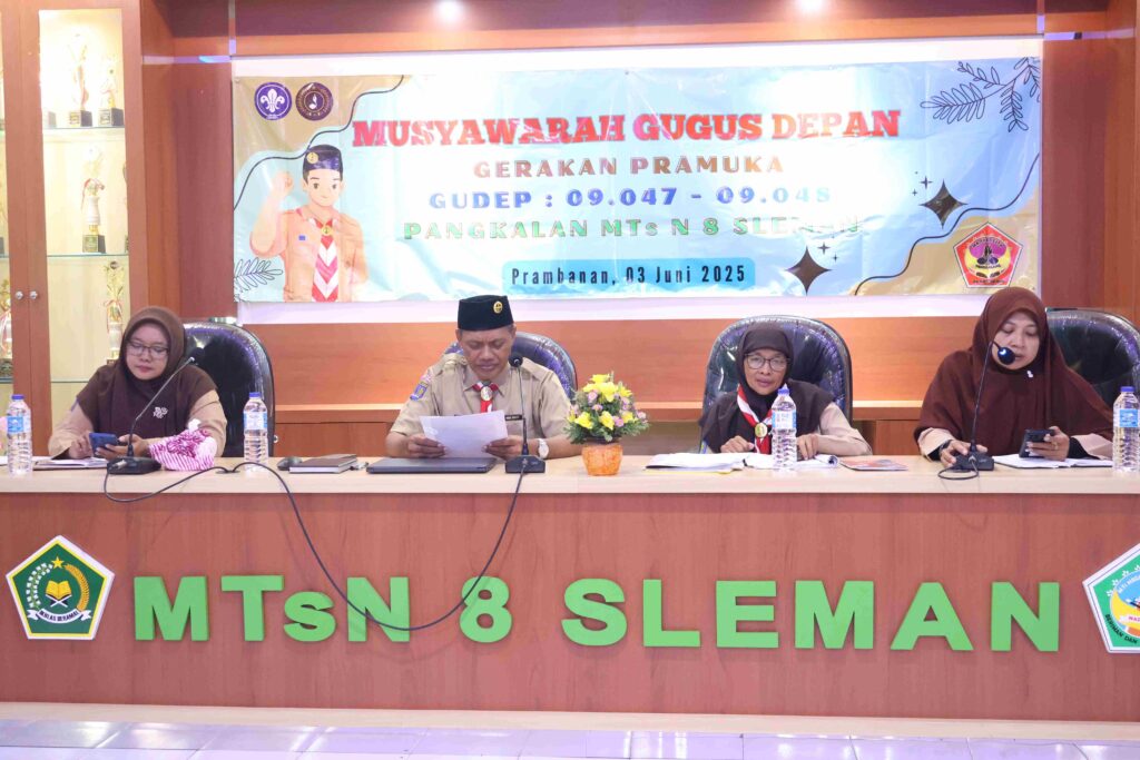 Kemenag Sleman News (MTsN 8 Sleman) — Gugus Depan 09.047–09.048 Pangkalan MTsN 8 Sleman terus menunjukkan komitmennya dalam membina peserta didik melalui Gerakan Pramuka. Dalam Musyawarah Gugus Depan  yang digelar pada Selasa (03/06/2025), salah satu fokus utama yang dibahas adalah persiapan pelaksanaan seleksi Pramuka Garuda, sebagai tindak lanjut dari kegiatan Bimbingan Teknis Pencapaian Pramuka Garuda yang sebelumnya telah digelar di MTsN 8 Sleman.