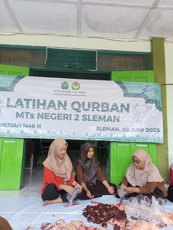 Sementara itu, sebagian daging lainnya didistribusikan kepada para guru, pegawai, serta warga sekitar madrasah sebagai bentuk kepedulian dan semangat berbagi. Kepala MTsN 2 Sleman, Dra. Hj. Titik Susilawati, M.Pd., mengungkapkan bahwa latihan qurban ini menjadi sarana pembelajaran nilai-nilai keagamaan yang kontekstual dan bermakna bagi para siswa.