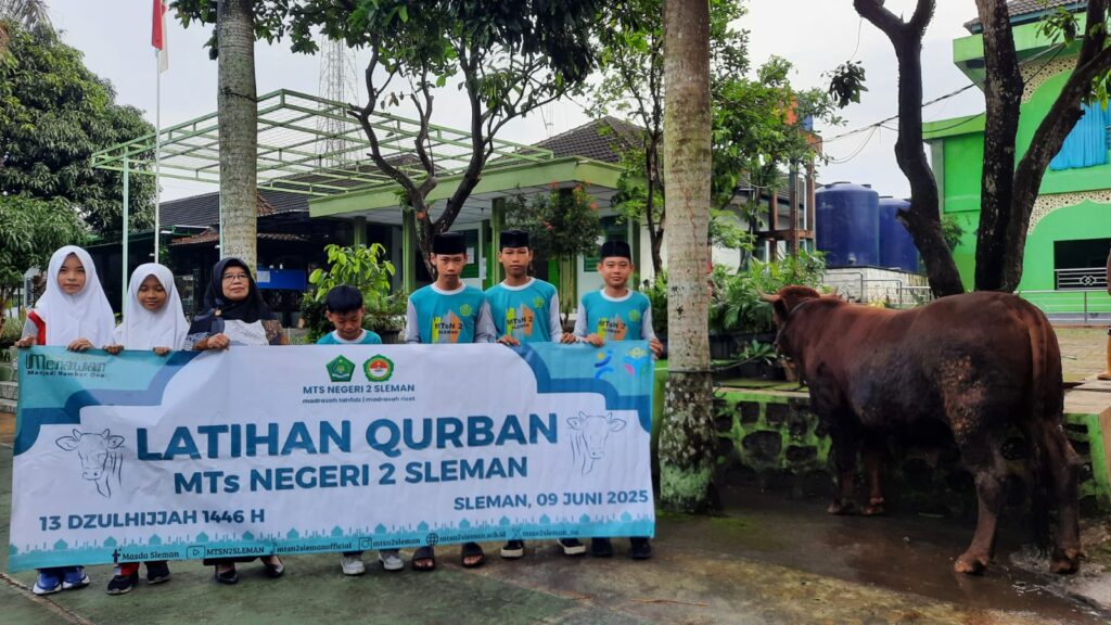 Kemenag Sleman News (MTsN 2 Sleman) — Dalam rangka merayakan Hari Raya Idul Adha sekaligus menanamkan nilai-nilai keikhlasan, kebersamaan, serta semangat berbagi, MTsN 2 Sleman menggelar kegiatan latihan qurban pada Senin (9/6/25) bertempat di lingkungan madrasah. Kegiatan ini melibatkan seluruh warga madrasah, baik guru, pegawai, maupun siswa.