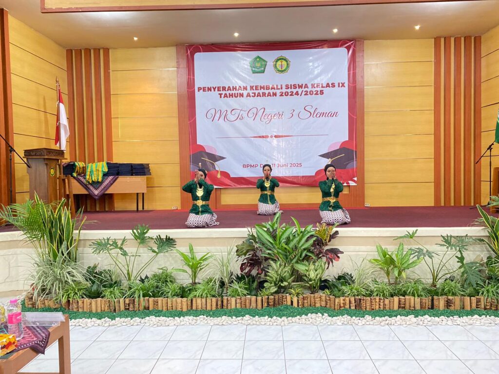 Kemenag Sleman News (MTs Negeri 3 Sleman) – Persembahan tari Nawung Sekar disuguhkan tim tari MTs Negeri 3 Sleman dalam acara pembukaan pelepasan purna siswa kelas IX di gedung BPMP DIY pada hari Rabu 11/6/2025 pukul 08.00 WIB. Diperagakan oleh tiga siswa kelas VIII sangat luwes, memukau dan gemulai.