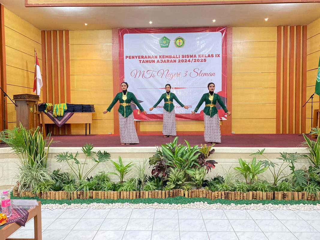 Kemenag Sleman News (MTs Negeri 3 Sleman) – Persembahan tari Nawung Sekar disuguhkan tim tari MTs Negeri 3 Sleman dalam acara pembukaan pelepasan purna siswa kelas IX di gedung BPMP DIY pada hari Rabu 11/6/2025 pukul 08.00 WIB. Diperagakan oleh tiga siswa kelas VIII sangat luwes, memukau dan gemulai.