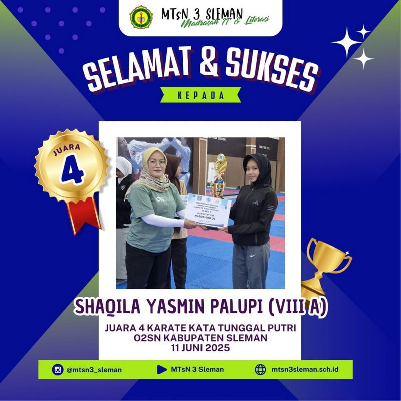 Sleman (MTsN 3 Sleman)_ Dalam Kejuaraan O2SN Kabupaten Sleman 2025 yang berlangsung di BPMP DIY pada Rabu (11/2025) Shaqila Yasmin Palupi kelas 8B mampu menyabet Juara 4 Karate Kata Tunggal Puteri O2SN tahun ini. Ia mampu menyabet medali tersebut berkat kerja keras, berlatih secara rutin serta bisa membagi waktu dengan baik sehingga dapat bertanding dan berusaha semaksimal mungkin untuk memperoleh medali. Walaupun demikian ia harus mengakui keunggulan lawan mainnya dan harus puas diurutan ketiga.