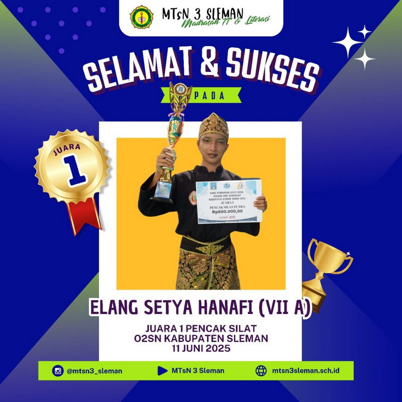 Sleman (MTsN 3 Sleman) – Nama MTsN 3 Sleman kembali berkibar setelah salah satu siswanya berhasil menjadi juara 1 pada Pencak Silat O2SN Kabupaten Sleman yang digelar Sabtu (11/6/2025) di BPMP DIY. Pesilat andalan MTsN 3 Sleman yang kembali mengukir prestasi adalah Elang Setya Hanafi. Di ajang yang diselenggarakan oleh Dispora inilah penampilan Elang sangat memesona dan sukses sehingga berhasil merebut satu medali diajang ini.