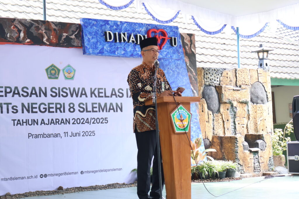 Kemenag Sleman News – (MTsN 8 Sleman) Suasana hangat dan penuh haru menyelimuti acara pelepasan siswa kelas 9 MTsN 8 Sleman Tahun Ajaran 2024/2025 yang digelar pada Rabu pagi (11/6/2025) di halaman madrasah. Acara tersebut mengangkat tema “Dinadimu: Di Sini Terukir Nama dan Mimpimu” sebagai refleksi perjalanan tiga tahun para siswa menuntut ilmu dan membangun mimpi di madrasah tercinta. Hadir dalam kesempatan ini Kepala Kantor Kementerian Agama Kabupaten Sleman, H. Sidik Pramono, S.Ag., M.Si., yang turut memberikan sambutan dan semangat bagi para lulusan.