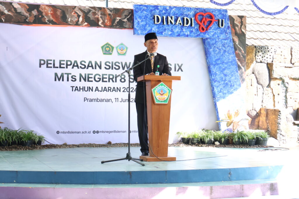 Kemenag Sleman News – (MTsN 8 Sleman) Kepala MTsN 8 Sleman, Agus Sholeh, S.Ag., memberikan sambutan yang menyentuh hati pada acara pelepasan siswa kelas 9 Tahun Ajaran 2024/2025 yang digelar meriah di halaman madrasah, Rabu (11/6/2025). Dalam suasana penuh haru dan kebanggaan, beliau menyampaikan apresiasi atas capaian para siswa yang telah menyelesaikan pendidikan selama tiga tahun di madrasah. Tak hanya sebagai momentum perpisahan, sambutan tersebut juga menjadi refleksi atas proses panjang pembentukan karakter dan ilmu yang telah dijalani bersama.