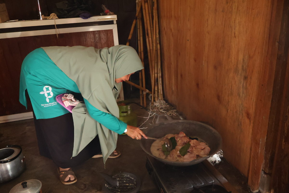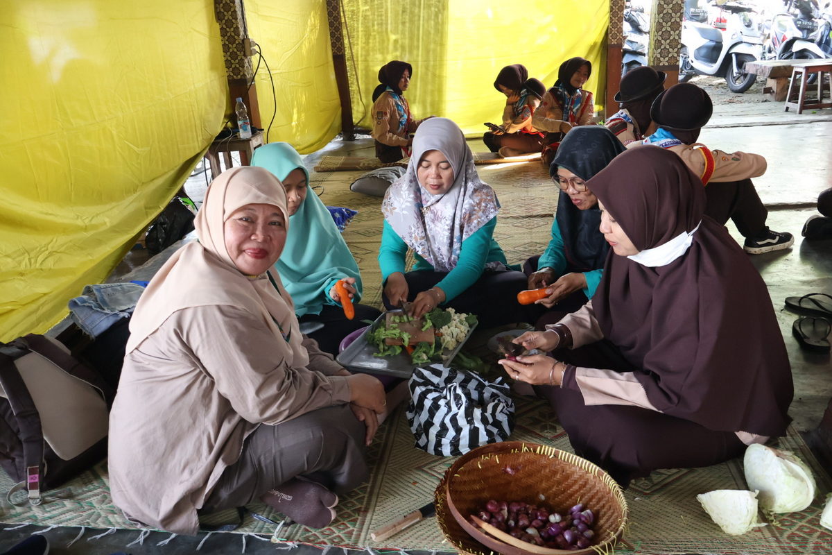 Kebersamaan para guru dan pegawai terlihat jelas dalam proses persiapan: ada yang membersihkan sayur, memotong ayam, menumis bumbu, hingga menata tempat makan. Semua dilakukan dengan antusias, diselingi canda tawa yang mencairkan suasana. Bahkan beberapa guru pria turut aktif membantu proses pengolahan bahan makanan.
