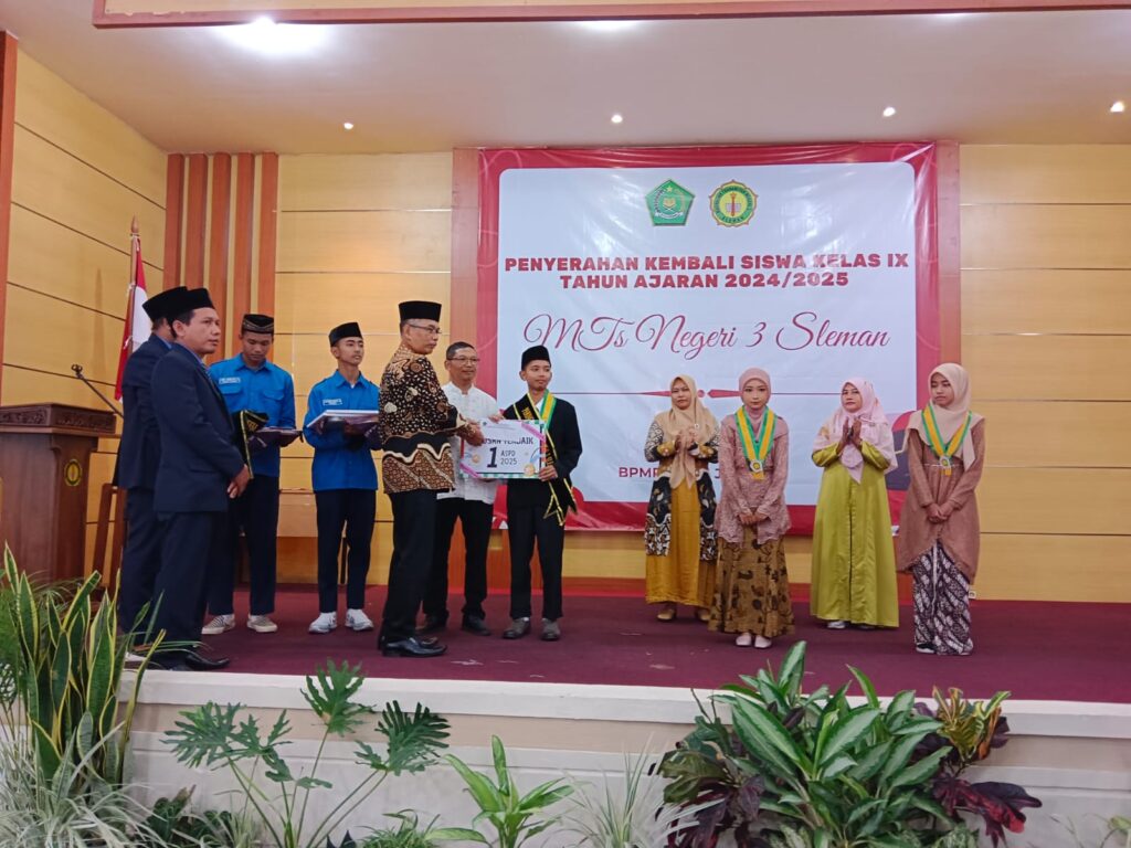 Kemenag Sleman News (MTsN 3 Sleman)_ Menjadi salah satu agenda rutin, MTsN 3 Sleman menganugerahkan berbagai kategori penghargaan bagi kelas IX sebagai apresiasi kiprahnya selama menempuh pendidikan. Penghargaan tersebut biasanya menjadi salah satu bagian dari rangkaian acara penyerahan kembali siswa kelas IX. Rabu, 11/6/2025, acara Penyerahan kembali Siswa Kelas IX Tahun Ajaran 2024-2025. Bertempat di Aula Balai Penjaminan Mutu Pendidikan (BPMP) D.I.Yogyakarta Jl. Tirtomartani, Karang Nongko, Tirtomartani, Kec. Kalasan, MTsN 3 Sleman menganugerahkan lima kategori penghargaan salah satunya adalah penghargaan bagi siswa yang meraih nilai Asesmen Standarisasi Pendidikan Daerah (ASPD) tertinggi.
