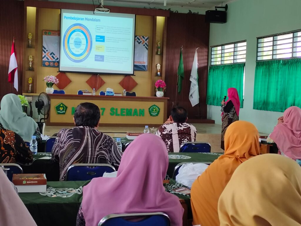 Kemenag Sleman News (MTs Negeri 3 Sleman) – Pembelajaran mendalam (deep learning) adalah cabang pembelajaran mesin yang menggunakan jaringan syaraf tiruan (artificial neural networks) dengan banyak lapisan untuk menganalisis data dan membuat keputusan, mirip dengan cara otak manusia memproses informasi. Workshop deep learning diselenggarakan oleh MGMP Matematika MTs Kabupaten Sleman pada hari Kamis 19/6/2025 pukul 12.20 WIB sampai 15.00 WIB di aula MTs Negeri 7 Sleman dengan narasumber Dra. Hj. Ida Uswatun Khasanah, M.Pd., pengawas pembina Kemenag Kabupaten Sleman. Workshop dibuka oleh kepala MTs N 7 Sleman dan dipimpin ketua MGMP Matematika MTs Kabupaten Sleman, Estyn Ariestika, M.Pd. dengan menyanyikan lagu Indonesia Raya.