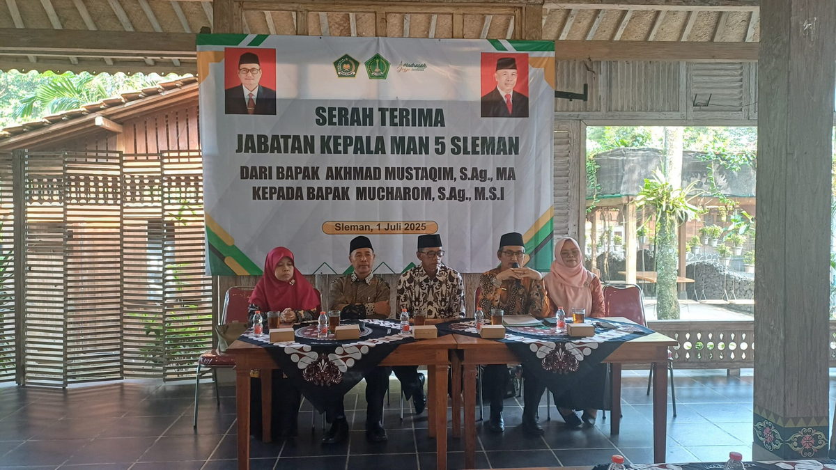 Kemenag Sleman News (MAN 5) — Sleman melaksanakan acara Serah Terima Jabatan (Sertijab) Kepala Madrasah dari Bapak Akhmad Mustaqim, S.Ag., MA kepada Bapak Mucharom, S.Ag., M.S.I. pada hari Selasa (1/7), bertempat di Joglo Jamal. Acara ini berlangsung dengan khidmat mulai pukul 09.00 WIB hingga 12.00 WIB dan dihadiri oleh rombongan dari MAN 4 Bantul, seluruh guru dan tenaga kependidikan MAN 5 Sleman, serta perwakilan dari Komite Madrasah.