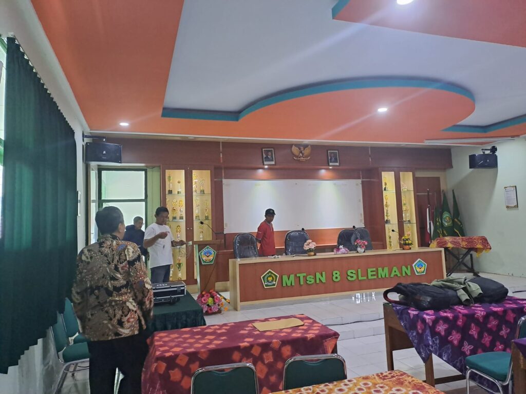 Kemenag Sleman News (MTsN 8 Sleman) – Setelah proses pemasangan perangkat sound system baru di Aula MTsN 8 Sleman selesai dilakukan pada Senin (30/06/2025), Wakil Kepala Madrasah Bidang Sarana dan Prasarana, Erwan Budiyanto, S.Pd., langsung melakukan pengecekan teknis untuk memastikan seluruh perangkat berfungsi optimal.