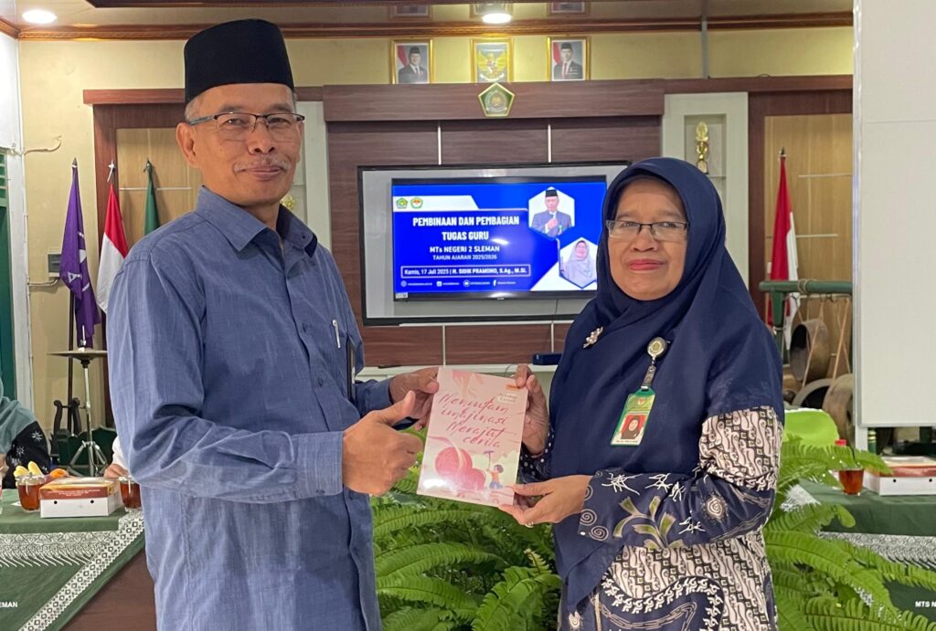 Kemenag Sleman News (MTsN 2 Sleman) — MTsN 2 Sleman menyerahkan buku antologi berjudul “Menyulam Imajinasi, Merajut Cerita” kepada Kepala Kantor Kementerian Agama Kabupaten Sleman, H. Sidik Pramono, S.Ag., M.Si., pada Kamis (11/7/25). Penyerahan tersebut dilakukan langsung oleh Kepala MTsN 2 Sleman, Dra. Hj. Titik Susilawati, M.Pd., sesaat setelah kegiatan pembinaan dan pembagian tugas guru selesai dilaksanakan di ruang aula madrasah.