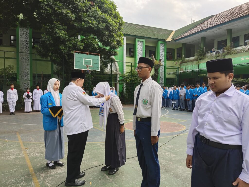 Secara simbolik, Kepala MAN 2 Sleman Drs. H. Wiranto Prasetyahadi, M.Pd., menyematkan tanda peserta kepada siswa baru, dan secara resmi kegiatan matsama dimulai. (Qoma)