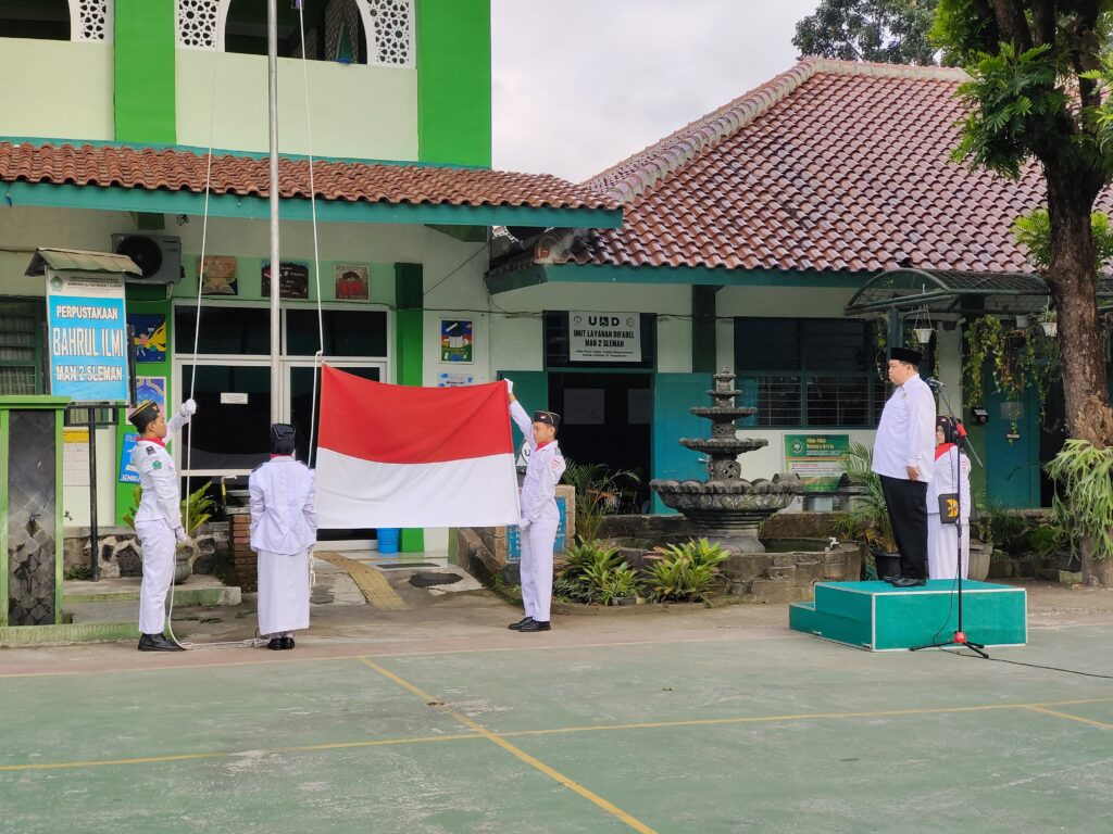 Bertugas sebagai pembina upacara Drs. H. Wiranto Prasetyahadi, M.Pd., dan petugas upacara dari Pleton Inti (Tonti) MAN 2 Sleman). Dalam amanatnya, wiranto menyampaikan untuk meningkatkan prestasi serta menjaga tingkah laku untuk membawa nama baik madrasah.