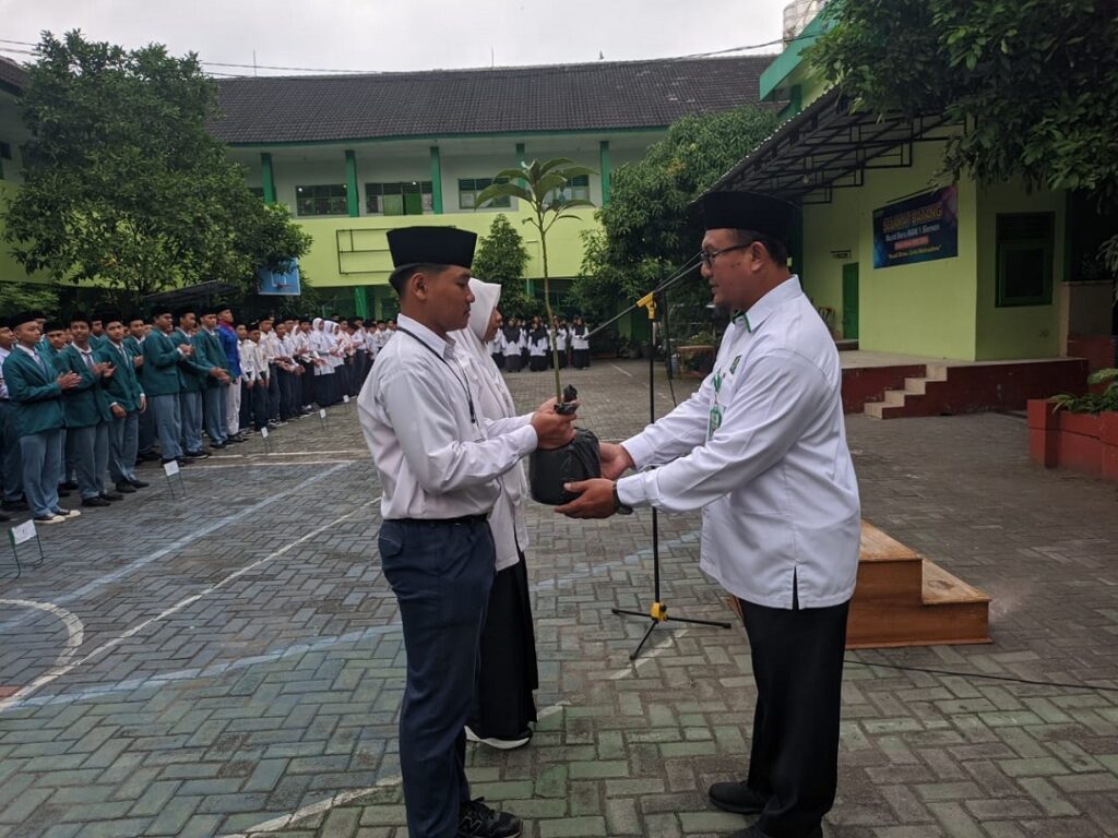 Momen haru menyelimuti halaman madrasah saat Kepala Madrasah Aliyah Negeri 1 Sleman, H. Anis Syafa’at, S.Ag., M.Pd.I, secara simbolis membuka kegiatan MATSAMA dengan menyerahkan bibit pohon kepada perwakilan siswa baru. Tindakan simbolis ini disambut tepuk tangan meriah dari seluruh peserta sebagai bentuk antusiasme dan harapan baru bagi para siswa.