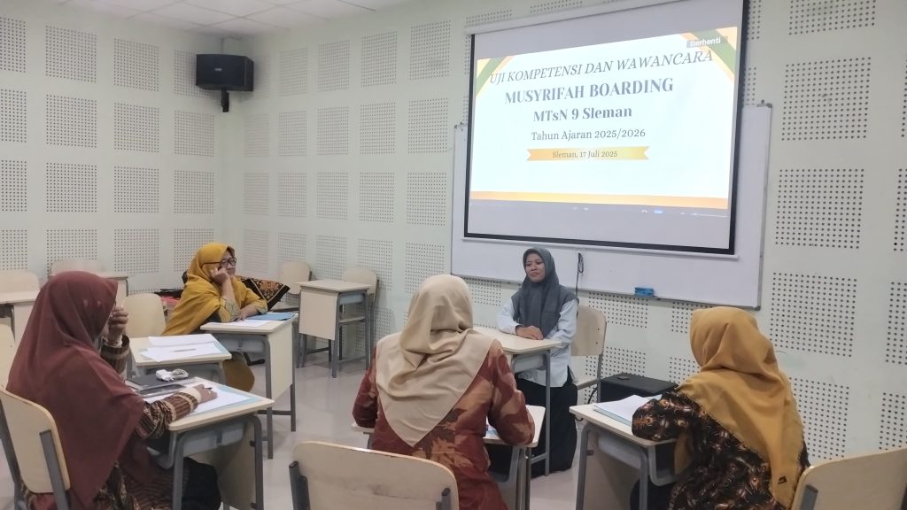 Kemenag Sleman News (MTsN 9 Sleman)— Dalam rangka menyiapkan tenaga pendamping asrama putri yang kompeten dan berdedikasi, MTsN 9 Sleman melaksanakan ujian seleksi perekrutan musyrifah untuk program Boarding pada Kamis (17/7/2025). Kegiatan ini diikuti oleh lima orang pendaftar yang memiliki minat dan tekad kuat untuk menjadi musyrifah.