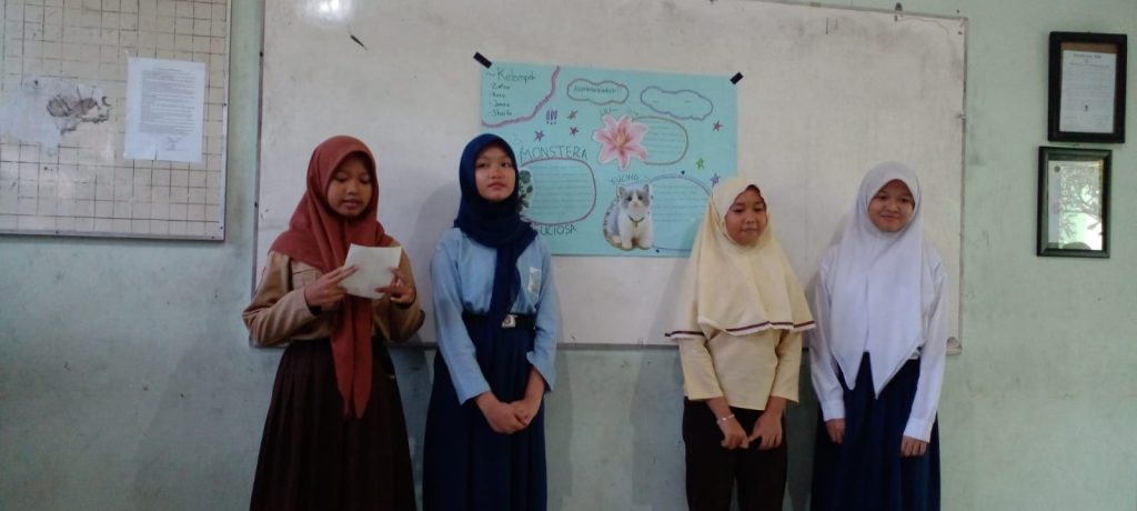 Dengan berkelompok, siswa mendiskusikan objek pilihan mereka, seperti hewan peliharaan, tempat wisata, tanaman, buah, atau tokoh idola. Setelah menyusun teks deskripsi secara bersama, masing-masing kelompok mempresentasikan hasilnya di depan kelas. Beberapa kelompok bahkan menampilkan gambar pendukung dan membacakan teks dengan penuh ekspresi.