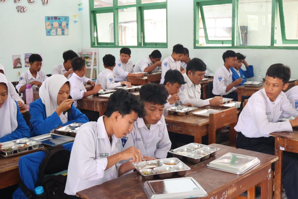 Menu hari pertama berupa nasi, ayam goreng crispy asam manis, tumis buncis, tahu goreng, dan buah kelengkeng disambut penuh suka cita. Raut bahagia tampak dari wajah para siswa yang menikmati sajian makan siang bersama teman-teman mereka. Hampir seluruh siswa bahkan terlihat menghabiskan seluruh isi piringnya dengan lahap.